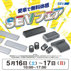 5月16日-17日「SEV」体感フェアを開催いたします! 5月16日(土)、17日(日)の2日間「SEV」体感フェアを開催いたします! 愛車でSEVを無料体感!オートバックスでSEVを体感しよう! 愛車にSEVを取り付け試乗してSEVの効...